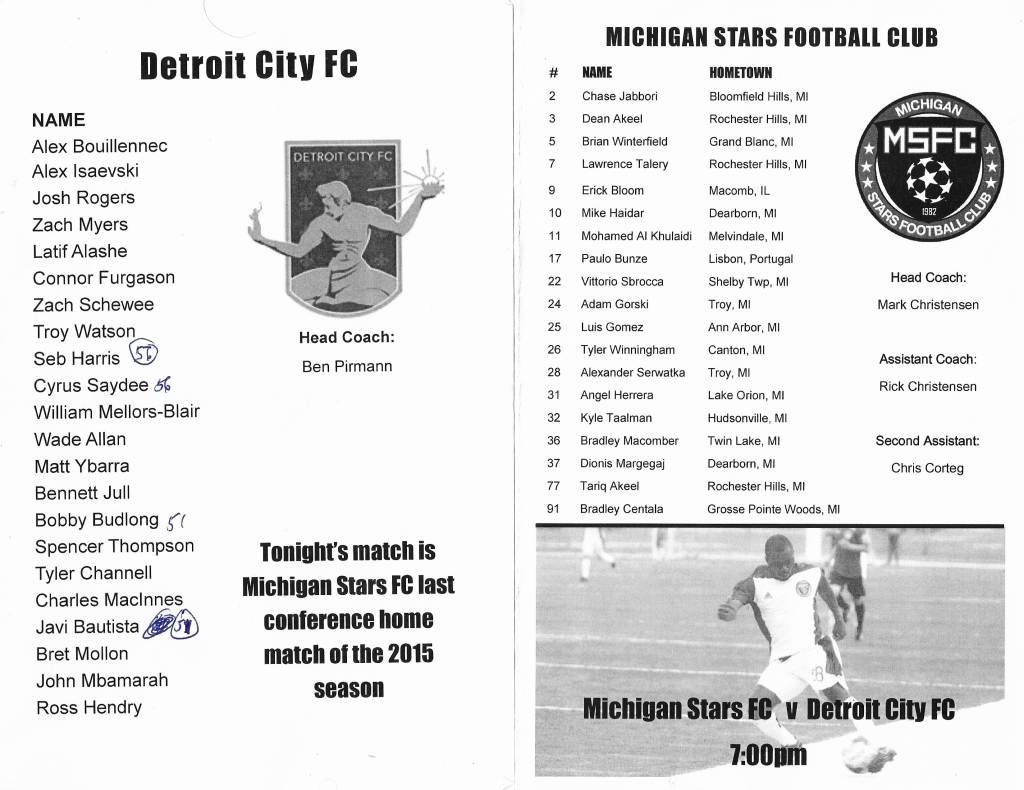 Final match of the regular season in Pontiac against the Michigan Stars.  I arrived early, garbed in my photographer’s vest peppered with City After Dark/NGS buttons, Rouge Rover scarf draped over my shoulders, and black DCFC cap.  Bought my ticket then went through the gate where I was met by two security guards.  One of them asked me if I was with the other team.