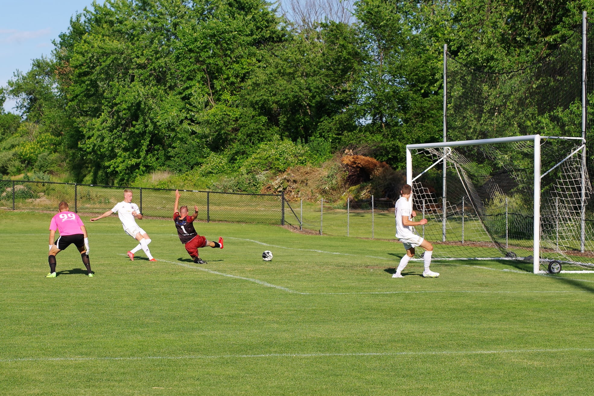 And once again, it was City dominance. In the 7th minute, Keith Larson and Bosh Tanyi broke in on the Bearings’ keeper, with Larson sending a lateral pass to Tanyi for the wide open goal. The keeper lost the offside argument he was trying to make with the sideline ref.