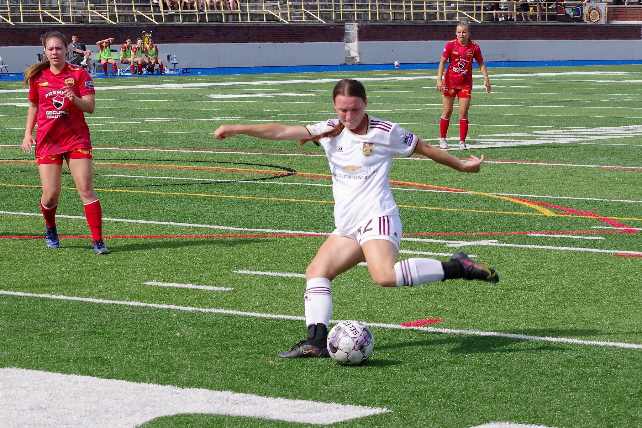 In the 84th minute, Margaret Berry broke up Flint’s offensive possession and passed the ball out wide to Ellie Pool. Fighting off a defender at the midfield stripe, Ellie sent a pass that found Kenna White. Kenna passed it back to Elisa Baeron in the City zone. Elisa went left, then delivered a long ball down the left sideline for Alia Frederick to run onto. Alia took it toward the goal, getting around a defender, then passed it to Kenna White. Kenna’s shot struck the reaching leg of a Flint defender, deflecting the ball to Ellie Pool. Ellie lifted the ball over the keeper and into the upper right corner of the net, to seal the victory.